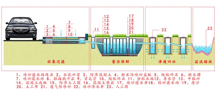 屋頂雨水、地面雨水和道路上的雨水都可以作為雨水收集的對(duì)象。由于仁創(chuàng)雨水收集系統(tǒng)的最上層是仁創(chuàng)透水磚,仁創(chuàng)透水磚具有過濾凈化雨水的功能,經(jīng)過初期過濾的雨水,通過收集管與透水地面進(jìn)入蓄存保鮮系統(tǒng)的分配水池,如果收集的雨水超過了雨水收集池的容量,會(huì)經(jīng)過溢流雨水管道單獨(dú)排出。